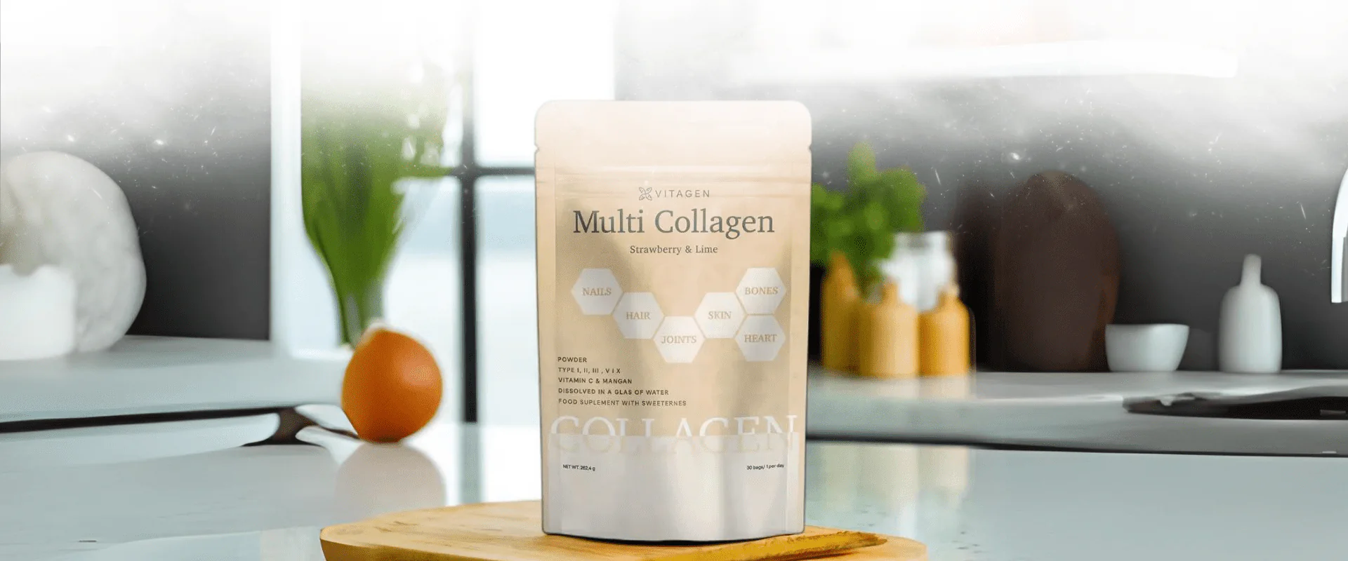 - Θα λατρέψετε την αναζωογονητική και φρουτώδη γεύση του προϊόντος πολυκολλαγόνου μας. Η απολαυστική του γεύση φράουλα-λάιμ επιτυγχάνεται μέσω φυσικών αρωμάτων και έχει σχεδιαστεί για να βελτιώνει την εμπειρία της καθημερινής σας πρόσληψης κολλαγόνου.